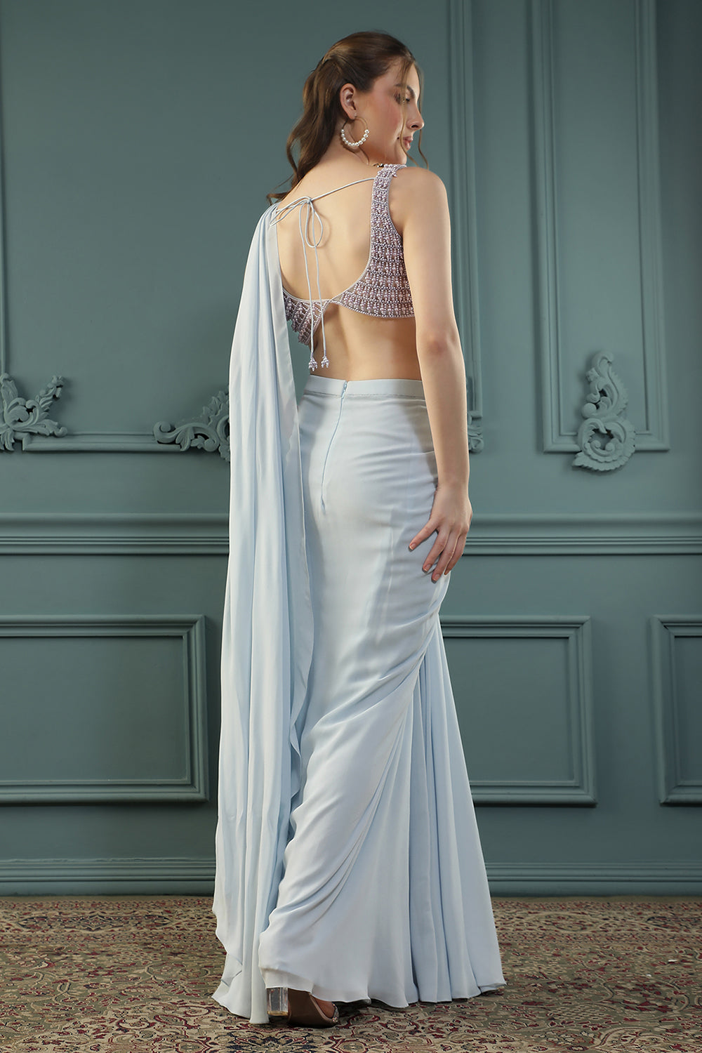 Powder Blue Pearl Pre-Drape Saree